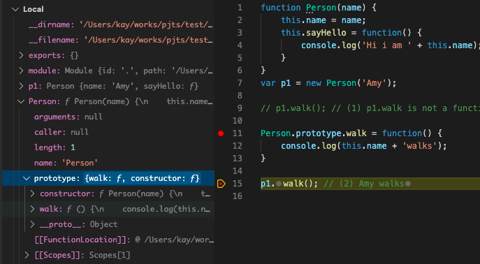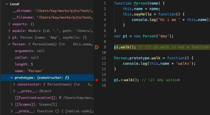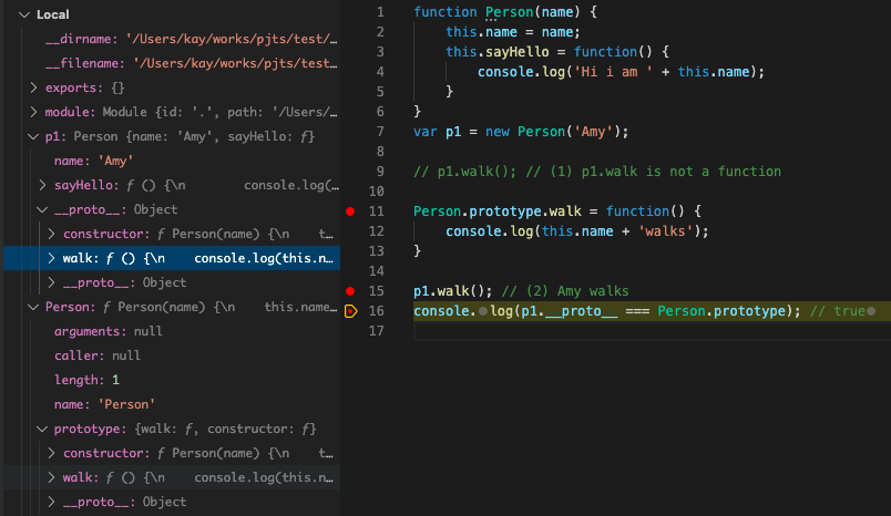 p1 이라는 객체는 walk라는 속성을 갖고 있지 않다. 하지만 어떻게 (2)에서 "Amy walks" 를 출력할 수 있을까? 바로 prototype 링크를 통해 Person.prototype.walk에 접근했기 때문에 가능한 것이다. 실제로 p1.__proto__ === Person.prototype 임을 확인할 수 있다.