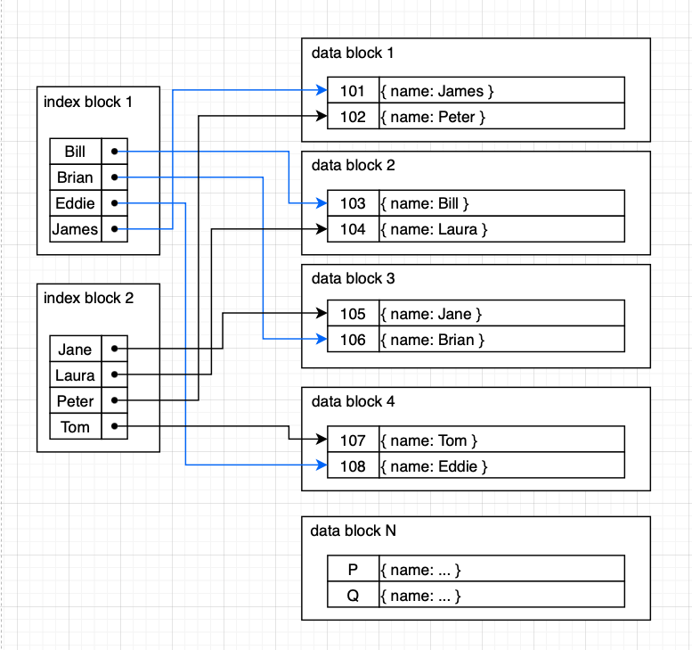 name이 Jane인 학생을 찾는 과정은 id=105로 Jane을 찾는 것과 비슷하다. 하지만 ASCII Code, 알파벳 순서대로 Bill~James의 범위의 레코드를 가져오려면 index block1로부터 data block1, data block2, data block3, data block4를 모두 읽어야 하므로 그림상 I/O가 5~6번 정도 발생할 것임이 보인다. 이처럼 범위로 데이터를 검색하는 경우는 clustered index에 비해 불리하고, 모든 data의 entry에 대해 색인을 갖고 있어야 해서 더 많은 공간을 차지하게 된다.
